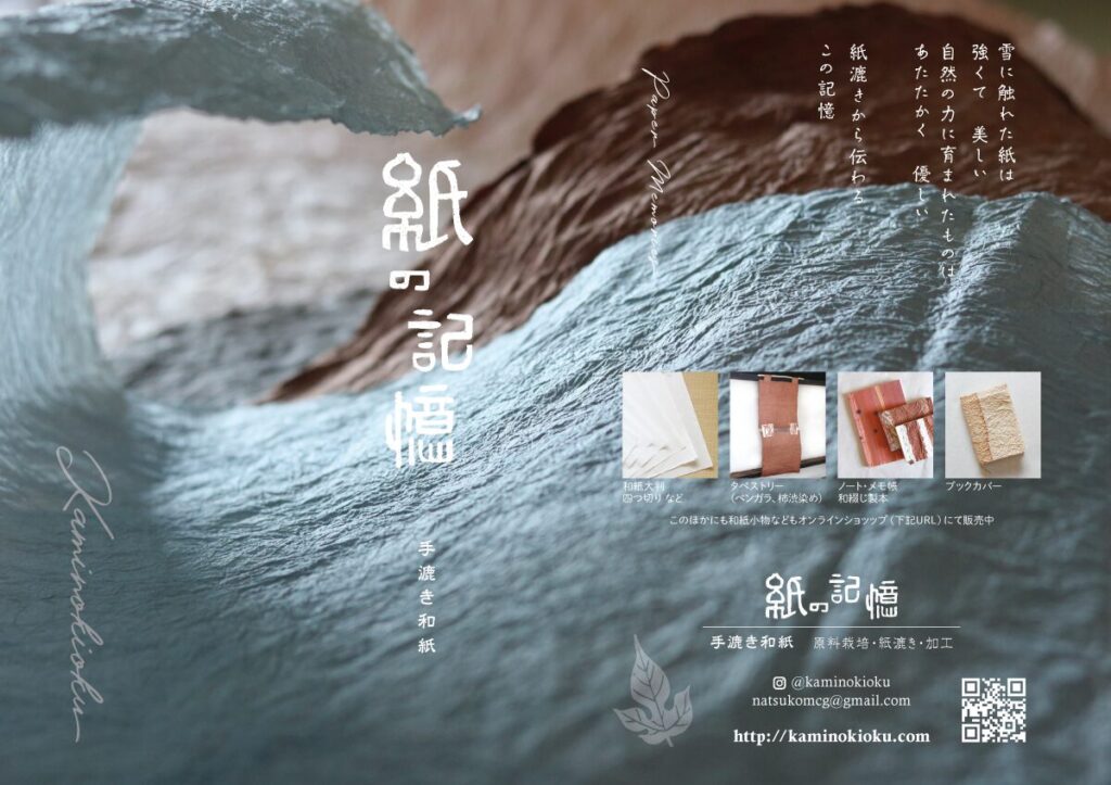 長野県飯山市には手漉き和紙の文化が残ります。そこに今では1社となった和紙工場が残り、そこへ有志の手漉き和紙の職人たちが通って紙を漉いています。そのなかのお一人で、私の友人でもある方からの、彼女の活動を紹介するパンフレットのデザイン制作のご依頼を2020年7月にいただきました。