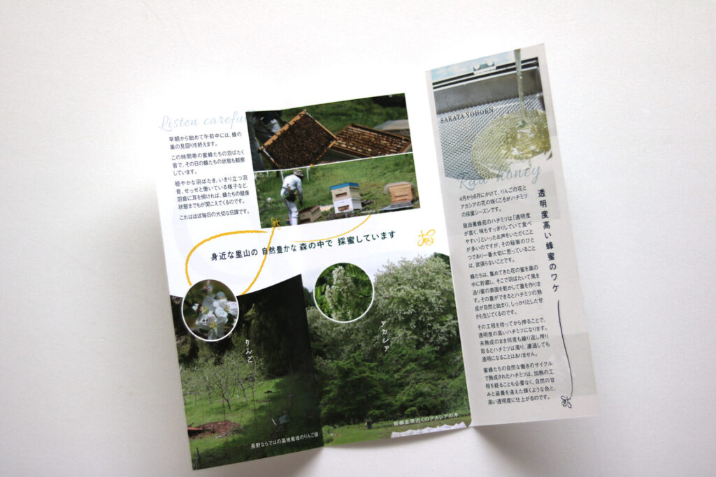長野県長野市の里山で養蜂をされていらっしゃる方から、ハチミツの商品リーフレット(パンフレット)のデザイン制作のご依頼をいただきました。